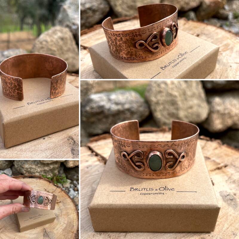 This wide cuff bracelet is handcrafted to be comfortable and stylish for any gender. Hand-forged out of recycled copper, this cuff will adjust slightly to achieve the perfect fit. This cuff measures 25 cm long, 3-2cm in heigth. The warm glow of raw copper with a green Aventurine gemstone compliments any style and combines with our other copper cuff styles or stacking!