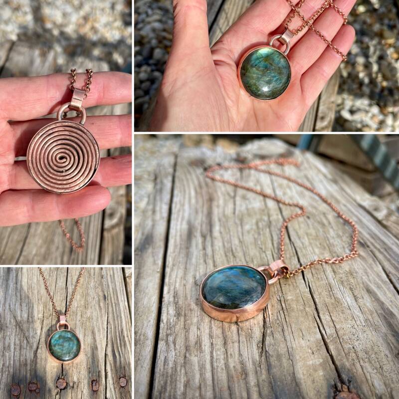 Round Labradorite Pendant and Chain Necklace comes with dramatic and Iridescent fire spectrums of the natural labradorite crystal in an oversized gemstone. It is set in pure solid copper with a spiral back.